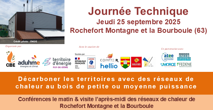 Le CIBE, l’ADUHME et Territoire d’énergie Puy-de-Dôme, organisent avec le soutien de l’ADEME, COMPTE-R, Hellio, AES,Hargassner France et Rochefort Montagne, et en partenariat avec ATEE, AMORCE, FNCCR et FEDENE, organise une journée technique avec pour thème "Décarboner les territoires avec des réseaux de chaleur au bois de petite ou moyenne puissance".